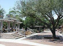 The beginning of Hilton Head as a resort started in 1956 with Charles E. Fraser developing Sea Pines Resort. Soon, other developments followed, such as Hilton Head Plantation, Palmetto Dunes Plantation, Shipyard Plantation, and Port Royal Plantation, imitating Sea Pines' architecture and landscaping. Sea Pines, however, continued to stand out by creating a unique locality within the plantation, called Harbour Town, anchored by a recognizable lighthouse.[35] Fraser was a committed environmentalist who changed the whole configuration of the marina at Harbour Town to save an ancient live oak.[13] It came to be known as the Liberty Oak, known to generations of children who watched singer and songwriter Gregg Russell perform under the tree for over 25 years.[36] Fraser was buried next to the tree when he died in 2002.[37]