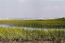 The terrain of a barrier island is determined by a dynamic beach system with offshore bars, pounding surf, and shifting beaches; as well as grassy dunes behind the beach, maritime forests with wetlands in the interiors, and salt or tidal marshes on the lee side, facing the mainland. A typical barrier island has a headland, a beach and surf zone, and a sand spit.[43]