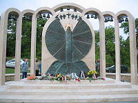 On May 7, 2006, a sculpture was inaugurated for Himnusz at Szarvas Square, Budakeszi, a small town close to Budapest. It was created by Mária V. Majzik, an artist with the Hungarian Heritage Award, depicting the full text of the poem in a circle, centered around a two metres high bronze figure of God, with 21 bronze bells in seven arches between eight pieces of stone, each four and a half metres high. The musical form of the poem can be played on the bells. The cost of its construction, 40 million forints (roughly 200,000 USD), was collected through public subscription.