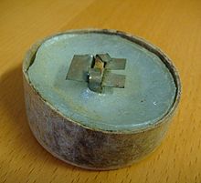 The Hindenburg light or Hindenburglicht, was a source of lighting used in the trenches of the First World War, named after the Commander-in-Chief of the German army in World War I, Paul von Hindenburg. It was also used in World War II in air raid shelters (Luftschutzkeller) or during power cuts, and mandated black outs as emergency lighting.[1] It was a flat bowl approximately 5–8 cm (2.0–3.1 in) diameter and 1–1.5 cm (0.39–0.59 in) deep. It resembles the cover of Mason jar lid (Schraubglasdeckel) and was made from pasteboard. This flat bowl was filled with a wax-like fat (tallow). A short wick (Docht) in the center was lit and burned for some hours. A later model of the Hindenburglicht was a "tin can (Dosenlicht) lamp." Here, a wax-filled tin can have two wicks in a holder. If both wicks are lit, a common, broad flame (zungenfoermige Flamme) results.