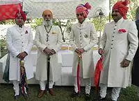 A sherwani also known as Achkan is normally worn by the bridegroom along with his own family form of a turban. He keeps a sword in his left hand during the ceremony. A bride wears a Lahanga, Odhani, Kurti or Poshak. The ornaments worn by a Rajput Bride are the Rakhdi on her forehead, the Sheesphul as headgear, the aad as a thick neck hanging, the Baju above her elbow (on arms), the "poonchis" and "bangdis" as thick golden bangles in arms, "hathfools" on hands and the Pajeb as anklets.