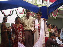 At each step, promises are made by (in the long-form—see below) each to the other.[3] The primary witness of a Hindu marriage is the fire-deity (or the Sacred Fire) Agni, in the presence of family and friends.[4] The ceremony is traditionally conducted entirely or at least partially in Sanskrit, considered by Hindus as the language of holy ceremonies. The local language of the bride and groom may also be used. The rituals are prescribed in the Gruhya sutra composed by various rishis such as Baudhayana and Ashvalayana.