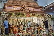 A Hindu wedding, known as Vivaha in Sanskrit,[1] or 'Shaadi ' is the traditional wedding ceremony for Hindus. The wedding ceremonies are very colourful, and celebrations may extend for several days. The bride's and groom's home—entrance, doors, wall, floor, roof—are sometimes decorated with colors, balloons, and other decorations.[2]