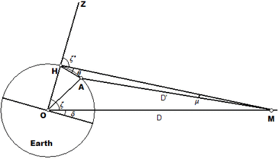 Like others before and after him, he also noticed that the Moon has a noticeable parallax, i.e., that it appears displaced from its calculated position (compared to the Sun or stars), and the difference is greater when closer to the horizon. He knew that this is because in the then-current models the Moon circles the center of the Earth, but the observer is at the surface—the Moon, Earth and observer form a triangle with a sharp angle that changes all the time. From the size of this parallax, the distance of the Moon as measured in Earth radii can be determined. For the Sun however, there was no observable parallax (we now know that it is about 8.8", several times smaller than the resolution of the unaided eye).