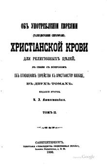 - Об употреблении евреями талмудистами-сектаторами христианской крови (1876) "About using Christian Blood by the Jews"