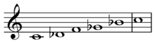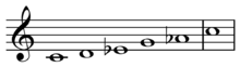 Burrows gives C-E-F♯-G-B.[3] Sachs,[4] as well as Slonimsky,[5] give C-D♭-F-G♭-B♭. Speed[2] and Kostka & Payne[6] give C-D-E♭-G-A♭. Note that all are hemitonic pentatonic scales (five note scales with one or more semitones) and are different modes of the same pattern of intervals, 2-1-4-1-4 semitones.