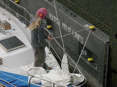 Vessels passing from the freshwater Lakes Washington and Union to Puget Sound enter the lock chamber through the open upper gates (A in the accompanying diagram). The lower gates (B) and the draining valve (D) are closed. The vessel is assisted by the lockwall attendants who assure it is tied down and ready for the chamber to be drained.[2]:2