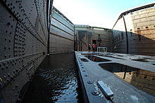 To further restrict saltwater intrusion, in 1966, a hinged barrier was installed just upstream of the large lock. This hollow metal barrier is filled with air to remain in the upright position, blocking the heavier salt water. When necessary to accommodate deep-draft vessels, the barrier is flooded and sinks to the bottom of the chamber.[2]:3