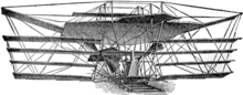 Maxim's father had earlier conceived of a helicopter powered by two counter-rotating rotors, but was unable to find a powerful enough engine to build it. Hiram first sketched out plans for a helicopter in 1872, but when he built his first "flying machine" he chose to use wings. Commencing work in 1889, he built a 145 feet (44 m) long craft that weighed 3.5 tons, with a 110 feet (34 m) wingspan that was powered by two compound 360 horsepower (270 kW) steam engines driving two propellers. In trials at Bexley in 1894 his machine rode on 1,800 feet (550 m) of rails and was prevented from rising by outriggers underneath and wooden safety rails overhead, somewhat in the manner of a roller coaster.[22] His apparent goal in building this machine was not to soar freely, but to test if it would lift off the ground. During its test run all of the outriggers were engaged, showing that it had developed enough lift to take off, but in so doing it damaged the track; the "flight" was aborted in time to prevent disaster. The craft was almost certainly aerodynamically unstable and uncontrollable, which Maxim probably realized, because he subsequently abandoned work on it.[23]