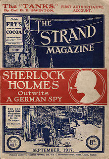 "His Last Bow. The War Service of Sherlock Holmes", later titled "His Last Bow: An Epilogue of Sherlock Holmes", is one of 56 short stories about Sherlock Holmes written by Sir Arthur Conan Doyle. It was first published in September 1917 in Strand Magazine and collected as the last of an anthology of eight stories titled His Last Bow: Some Reminiscences of Sherlock Holmes the following month. The narration is in the third person, instead of the first person narration usually provided by the character of Dr. Watson, and it is a spy story, rather than a detective mystery. Due to its portrayal of British and German spies on the eve of war, its publication during the First World War and its patriotic themes, the story has been interpreted as a propaganda tool intended to boost morale for British readers.