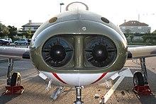 The HA-200's propulsion consisted of a pair of Turbomeca Marboré turbojet engines, which were installed in a side-by-side arrangement inside the forward fuselage and mounted on a stressed-skin structure that forms the outer surface of the fuselage's underside.[15] Air was fed to the engines via a large intake on the front of the nose; this particular intake arrangement has been described as being unique amongst jet aircraft.[13] The engine's exhaust nozzles were located upon the lower fuselage, just aft of the trailing edge of the wing.[16] A maximum of 261 gallons of fuel could be carried across a pair of fuselage tanks, two wing tanks and two permanently-attached tip tanks; provisions were made for jettisoning fuel in emergency situations.[15] For weapons training purposes, the HA-200 featured provisions for the carriage of armaments.[6]