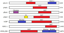 | Esa1 | S. cerevisiae | NuA4, piccolo NuA4 | H2A, H4, (H2B, H3) | Chromodomain |