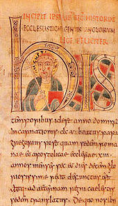 A historiated initial is an initial, an enlarged letter at the beginning of a paragraph or other section of text, that contains a picture. Strictly speaking, a historiated initial depicts an identifiable figure or a specific scene, while an inhabited initial contains figures (human or animal) that are decorative only, without forming a subject. Both sorts became very common and elaborate in luxury illuminated manuscripts. These illustrated initials were first seen in the Insular art of the early 8th century. The earliest known example is in the Saint Petersburg Bede, an Insular manuscript of 731-46, and the Vespasian Psalter has another.[1]
