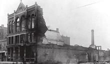 The second tragedy struck on October 28, 1892. A fire started by spontaneous combustion at the Union Oil & Paint Co. [4] building along the Milwaukee River at Water Street. Strong winds of up to 50 mph helped to spread the fire to the Ward's other buildings. The fire quickly grew out of control.[5] Cities such as Chicago, Kenosha, Racine, Sheboygan and Oshkosh sent horse-drawn units by rail to help Milwaukee's fire department fight the flames. A total of 440 buildings were destroyed and more than 1,900 people, mostly Irish families, were left without homes by the time the fire was finally under control at midnight.[3] Those families sought shelter in the Third Ward School, the Cathedral of St. John the Evangelist, and the old St. Gall’s Church housed hundreds overnight. Victims also received meal tickets to restaurants and clothing.