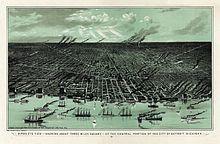 The Detroit race riot of 1863 occurred on March 6, 1863 and was the city's first such incident, as Irish and German Catholics resisted the mandatory draft laws. At the time, it was reported as "the bloodiest day that ever dawned upon Detroit."[27] The casualties of the day included at least two people dead, and many others injured, mostly African-American, 35 buildings were burned to the ground, and a number of other buildings were damaged by fire.[28]