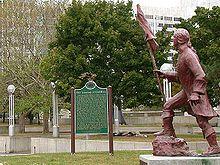 Prior to the American Civil War, the city's access to the Canada–US border made it a key stop for runaway slaves along the underground railroad.[25] The Michigan Soldiers' and Sailors' Monument in Detroit's Campus Martius Park commemorates the state's role in the American Civil War. Thousands of Detroiters formed volunteer regiments, including the 24th Michigan Volunteer Infantry Regiment (part of the legendary Iron Brigade) which fought with distinction and suffered 82% casualties at Gettysburg in 1863. Abraham Lincoln is quoted as saying Thank God for Michigan! Following Lincoln's assassination, General George Armstrong Custer delivered a eulogy to the thousands gathered near Campus Martius Park. Custer led the Michigan Brigade during the American Civil War and called them the Wolverines.[26]