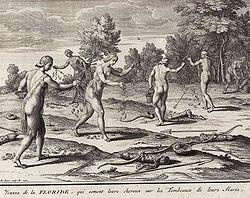 Although it is often stated that he sighted the peninsula for the first time on March 27, 1513 and thought it was an island, he probably saw one of the Bahamas at that time.[25] He went ashore on Florida's east coast during the Spanish Easter feast, Pascua Florida, on April 7 and named the land La Pascua de la Florida. After briefly exploring the land south of present-day St. Augustine, the expedition sailed south to the bottom of the Florida peninsula, through the Florida Keys, and up the west coast as far north as Charlotte Harbor, where they briefly skirmished with the Calusa before heading back to Puerto Rico. From 1513 onward, the land became known as La Florida. After 1630, and throughout the 18th century, Tegesta (after the Tequesta tribe) was an alternate name of choice for the Florida peninsula following publication of a map by the Dutch cartographer Hessel Gerritsz in Joannes de Laet's History of the New World.[26][27][28]