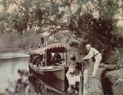 In 1763, Spain traded Florida to the Kingdom of Great Britain for control of Havana, Cuba, which had been captured by the British during the Seven Years' War. It was part of a large expansion of British territory following the country's victory in the Seven Years' War. Almost the entire Spanish population left, taking along most of the remaining indigenous population to Cuba. The British divided the territory into East Florida and West Florida.[40][41] The British soon constructed the King's Road connecting St. Augustine to Georgia. The road crossed the St. Johns River at a narrow point, which the Seminole called Wacca Pilatka and the British named "Cow Ford", both names ostensibly reflecting the fact that cattle were brought across the river there.[42][43][44] The British government gave land grants to officers and soldiers who had fought in the French and Indian War in order to encourage settlement. In order to induce settlers to move to the two new colonies reports of the natural wealth of Florida were published in England. A large number of British colonists who were "energetic and of good character" moved to Florida, mostly coming from South Carolina, Georgia and England though there was also a group of settlers who came from the colony of Bermuda. This would be the first permanent English-speaking population in what is now Duval County, Baker County, St. Johns County and Nassau County. The British built good public roads and introduced the cultivation of sugar cane, indigo and fruits as well the export of lumber. As a result of these initiatives northeastern Florida prospered economically in a way it never did under Spanish rule. Furthermore, the British governors were directed to call general assemblies as soon as possible in order to make laws for the Floridas and in the meantime they were, with the advice of councils, to establish courts. This would be the first introduction of much of the English-derived legal system which Florida still has today including trial-by-jury, habeas corpus and county-based government.[45][46]
