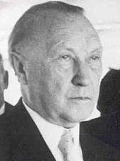 Altogether, around 8 million ethnic German refugees and expellees from across Europe eventually settled in West Germany, with a further 3 million in East Germany. In West Germany these represented a major voting block; maintaining a strong culture of grievance and victimhood against Soviet Power, pressing for a continued commitment to full German reunification, claiming compensation, pursuing the right of return to lost property in the East, and opposing any recognition of the postwar extension of Poland and the Soviet Union into former German lands.[10] Owing to the Cold War rhetoric and successful political machinations of Konrad Adenauer, this block eventually became substantially aligned with the Christian Democratic Union of Germany; although in practice 'westward-looking' CDU policies favouring the Atlantic Alliance and the European Union worked against the possibility of achieving the objectives of the expellee population from the east through negotiation with the Soviet Union. But for Adenauer, fostering and encouraging unrealistic demands and uncompromising expectations amongst the expellees would serve his "Policy of Strength" by which West Germany contrived to inhibit consideration of unification or a final Peace Treaty until the West was strong enough to face the Soviets on equal terms. Consequently, the Federal Republic in the 1950s adopted much of the symbolism of expellee groups; especially in appropriating and subverting the terminology and imagery of the Holocaust; applying this to post-war German experience instead.[11] Eventually in 1990, following the Treaty on the Final Settlement With Respect to Germany, the unified Germany indeed confirmed in treaties with Poland and the Soviet Union that the transfer of sovereignty over the former German eastern territories in 1945 had been permanent and irreversible; Germany now undertaking never again to make territorial claims in respect of these lands.
