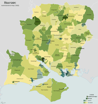 After the Norman Conquest the county was favoured by Norman kings who established the New Forest as a hunting forest. The county was recorded in the Domesday Book divided into 44 hundreds.[1] These later consolidated to 37. These were Alton, Andover, Barmanstip, Barton Stacey, Basingstoke, Bedbridge, Bondsborough, Bosmere, Buddlesgate, Christchurch, Chutely, Crondall, East Meon, Evinger, Fawley, Finchdean, Fordingbridge, Hambledon, Heling, Holdsett, King's Somborne, Kingsclere, Mansbridge, Meanstoke, Micheldever, New Forest, Odiham, Overton, Pastrow, Portsdown, Ringwood, Shelbourn, Sutton, Thorngate, Titchfield, Waltham and Wherwell.
