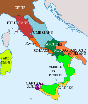 Italian history can be said to have started in the 9th century BCE, when earliest accounts record the presence of Italic tribes in present-day central Italy. Linguistically, they were divided into Oscans, Umbrians and Latins. Later the Latin culture became dominant, as Rome emerged as a powerful city-state around 350 BC. Other pre-Roman civilizations include Magna Graecia (or Greater Greece), when Greeks began settling in Southern Italy in the 8th century BC and lasted until the 3rd century BC and also the Etruscan civilization, which flourished between 900 and 150 BC in the central section of the peninsula.[1]