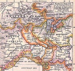 In the 14th century, Northern Italy and upper Central Italy were divided into a number of warring city-states, the most powerful being Milan, Florence, Pisa, Siena, Genoa, Ferrara, Mantua, Verona and Venice. High Medieval Northern Italy was further divided by the long running battle for supremacy between the forces of the Papacy and of the Holy Roman Empire. Each city aligned itself with one faction or the other, yet was divided internally between the two warring parties, Guelfs and Ghibellines.