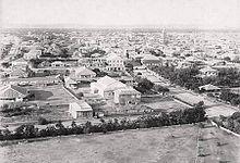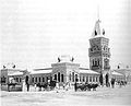 In 1795, the village became a domain of the Balochi Talpur rulers. A small factory was opened by the British in September 1799, but was closed down within a year. In 1864, the first telegraphic message was sent from India to England when a direct telegraph connection was laid between Karachi and London.[17] In 1878, the city was connected to the rest of British India by rail. Public building projects such as Frere Hall (1865) and the Empress Market (1890) were undertaken. In 1876, Muhammad Ali Jinnah, the founder of Pakistan, was born in the city, which by now had become a bustling city with Temples, mosques, churches, courthouses, markets, paved streets and a magnificent harbour. By 1899, Karachi had become the largest wheat exporting port in the east.[18] The population of the city was about 105,000 inhabitants by the end of the 19th century, with a cosmopolitan mix of Muslims, Hindus, Europeans, Jews, Parsis, Iranians, Lebanese, and Goans. The city faced a huge cholera epidemic in 1899.[19] By around the start of the 20th century, the city faced street congestion, which led to South Asia's first tramway system being laid down in 1900.