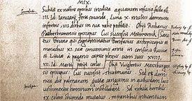 The Lithuanian tribe is thought to have developed more recognizably toward the end of the first millennium.[9] The first known reference to Lithuania as a nation ("Litua") comes from the Annals of the Quedlinburg monastery, dated March 9, 1009.[13] In 1009, the missionary Bruno of Querfurt arrived in Lithuania and baptized the Lithuanian ruler "King Nethimer."[14]