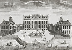 William III, a Dutchman, cared little for London, the smoke of which gave him asthma, and after the first fire at Whitehall Palace (1691) he purchased Nottingham House and transformed it into Kensington Palace. Kensington was then an insignificant village, but the arrival of the court soon caused it to grow in importance. The palace was rarely favoured by future monarchs, but its construction was another step in the expansion of the bounds of London. During the same reign Greenwich Hospital, then well outside the boundary of London, but now comfortably inside it, was begun; it was the naval complement to the Chelsea Hospital for former soldiers, which had been founded in 1681. During the reign of Queen Anne an act was passed authorising the building of 50 new churches to serve the greatly increased population living outside the boundaries of the City of London.[33]