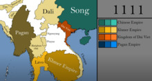 Pamheiba's rise to prominence as a military conqueror can be divided into three phases. The first phase (1710–17) focused on internal consolidation of hill tribes. Phase two (1728–33) involved war against the Burmese kingdom of Awa, and the third and final phase (1745–48) saw a war against Tripura in the northeast. Shortly after taking power from his father Charairongba he invaded Burma after the Burmese King insulted his sister. The Burmese King asked for the hand of another of Charairongba's daughters in marriage in 1724. Instead of a princess, the King of Burma was met by cavalry, led by Pamheiba that massacred the Burmese army, and brought many prisoners of war to Imphal.[16] The Burmese sent an expedition in revenge, but it was ambushed in the swamps near Heirok, southwest of Thoubal, and losing heavily retreated in haste. In 1735, Pamheiba invaded Myedu in Shwebo district and carried off loot, cattle and a thousand people. In 1737, Pamheiba again invaded Burma, killed two-thirds of a royal levy, including commander, who came to oppose the invading Manipuris, and swept down to Tabayin in Shwebo district, burning everything they met.[17] Again in 1738, Manipuris went and camped in Thalunbyu west of Sagaing, burnt every house and monastery up to the walls of Ava, stormed the stockade built to protect the Kaunghmudaw pagoda, slaughtering the Burmese troops like cattle in a pen and killing the commandant, a minister of the Hluttaw Council; the old door-leaves of the pagoda's eastern gateway show a gash made by the sword of Maharaj Pamheiba when he was forcing an entrance.[18]