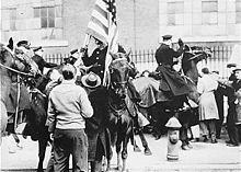 The policies of Woodrow Wilson's administration reunited reformers with the city's Republican Party and World War I temporarily halted the reform movement. In 1917, the murder of George Eppley, a police officer defending City Council primary candidate James Carey, ignited the reformers again. They passed legislation to reduce the City Council from two houses to one, and provided council members an annual salary.[80] With the deaths of McNichol in 1917 and Penrose in 1921, William Vare became the city's political boss. In the 1920s the public flouting of Prohibition laws, mob violence, and police involvement in illegal activities led Mayor W. Freeland Kendrick to appoint Brigadier General Smedley Butler of the U.S. Marine Corps as director of public safety. Butler cracked down on bars and speakeasies and tried to stop corruption within the police force, but demand for liquor and political pressure made the job difficult, and he had little success. After two years, Butler left in January 1926 and most of his police reforms were repealed. On August 1, 1928, Boss Vare suffered a stroke, and two weeks later a grand jury investigation into the city's mob violence and other crimes began. Numerous police officers were dismissed or arrested as a result of the investigation, but no permanent change resulted.[81] Strong support among some residents for the Democratic presidential candidate Al Smith, who was Catholic, marked the city's turning away in the 20th century from the Republican Party.[82]