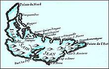 In 1604, France claimed the lands of the Maritimes and established the French colony of Acadia. After the Treaty of Utrecht in 1713, the French colony of Île Royale, the island was called Île Saint-Jean. The first French settlers arrived in 1719 on a ship wrecked at Naufrage. The settlers lived primarily at Port-LaJoye and Havre Saint-Pierre (St. Peter's Harbour).[3] At Port-LaJoye there was an administrative unit and a garrison, detached from Louisbourg, where sat the government for both Ile Royale and Île Saint-Jean. While new settlements were established along the Rivier-du-Nord-Est and at but Havre Saint-Pierre remained the largest population throughout the French occupation of the Island.[4]