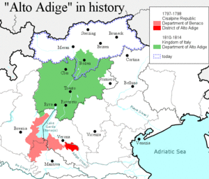 Napoleon created in 1810 the Department of Alto Adige that included most of actual Trentino and the area around Bolzano in Alto Adige.[2] It was part of Napoleon's Kingdom of Italy for some years.