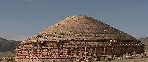 The religion of the ancient Berbers is undocumented and only funerary rites can be reconstructed from archaeological evidence. Burial sites provide an early indication of religious beliefs; almost sixty thousand tombs are located in the Fezzan alone, according to the Italian scholar Giacomo Caputo.[16]:23 A more recent tomb, the Medracen in eastern Algeria, still stands. Built for a Berber king and traditionally assigned to Masinissa (r. 202–149 BC), it may have belonged instead to his father Gala (or Gaia). The architecture of the elegant tower tomb of his contemporary Syphax shows Greek or Punic influence.[19] Most other information about Berber religious beliefs comes from later, classical times. The Libyans believed that divine power showed itself in the natural world, and could, for example, inhabit bodies of water or reside in stones, which were objects of worship. Procreative power was symbolized by the bull, the lion, and the ram. Among the proto-Berbers in the area that is now Tunisia, images of fish, often found in mosaics excavated there, were phallic symbols that fended off the evil eye, while sea shells signified the female sex.[20] Herodotus mentions that Libyans of the Nasamone tribe slept on the graves of their ancestors in order to induce dreams for divination. Libyans sacrificed to the sun and to the moon (Ayyur).[21] Eventually supernatural entities became personalized as gods, perhaps influenced by Egyptian or Punic practice; yet the Berbers seemed to be "drawn more to the sacred than to the gods."[22] Often only a little more than the names of the Berber deities are known, e.g., Bonchar, a leading god.[23] Eventually, Berbero-Libyans came to adopt elements from ancient Egyptian religion. Herodotus writes of the divine oracle sourced in the Egyptian god Ammon located among the Libyans, at the oasis of Siwa.[24] Later, Berber beliefs influenced the Punic religion of Carthage, the city-state founded by the Phoenicians.[25][26]