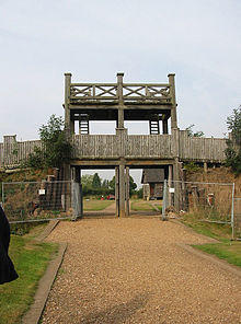 Following the revolt in AD60/1 of the Iceni under their Queen Boudica most scholars have assumed that, after the burning of Colchester and London, Boudica followed Suetonius up Watling Street as he headed for his supply bases and lines of communication near to the milItary frontier.[10] Suetonius offered battle in a strong defensive position described by Tacitus[11] and many fruitless attempts have been made to be more precise regarding the site of the Battle of Watling Street, the last battle of Boudica. The historian, Dr Graham Webster has suggested it took place near Manduessedum ("the place of the war chariots"),[12] modern day Mancetter[13] and military finds of armour and military coinage relating to the 14th Legion, whom Tacitus[11] records formed part of Suetonius' army, have been found in the region, giving weight to Webster's hypothesis.[10] Another possible site put forward by Jack Lucas is the area east of Rugby, and whilst other theories exist for locations outside of Warwickshire, the exact location is unknown. After the defeat of the Iceni reinforcements were sent by the Romans from Germany[14] and a great supply base was set up at a place called the Lunt in Baginton near Coventry which has the unique feature of a circular arena or gyrus [4] for the breaking in of horses and which could have been a collecting point for Iceni horses after the battle.[10]