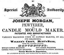 The manufacture of candles became an industrialised mass market in the mid 19th century. In 1834, Joseph Morgan, a pewterer from Manchester, England, patented a machine that revolutionised candle making. It allowed for continuous production of molded candles by using a cylinder with a moveable piston to eject candles as they solidified. This more efficient mechanized production produced about 1,500 candles per hour, (according to his patent ". . with three men and five boys [the machine] will manufacture two tons of candle in twelve hours"). This allowed candles to become an easily affordable commodity for the masses.[9]