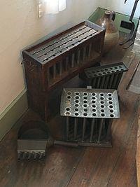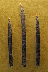 The Han Dynasty (202 BCE – 220 AD) Jizhupian dictionary of about 40 BCE hints at candles being made of beeswax, while the Book of Jin (compiled in 648) covering the Jin Dynasty (265–420) makes a solid reference to the beeswax candle in regards to its use by the statesman Zhou Yi (d. 322).[6] An excavated earthenware bowl from the 4th century AD, located at the Luoyang Museum, has a hollowed socket where traces of wax were found.[6] Generally these Chinese candles were molded in paper tubes, using rolled rice paper for the wick, and wax from an indigenous insect that was combined with seeds.[7]