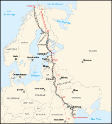 The Scandinavian-Russian meridian arc or Struve Geodetic Arc, named after the German astronomer Friedrich Georg Wilhelm von Struve, was a degree measurement that consisted of a nearly 3000 km long network of geodetic survey points. The Struve Geodetic Arc was one of the most precise and largest projects of the earth measurement at that time. In 1860 Friedrich Georg Wilhelm Struve published his Arc du méridien de 25° 20′ entre le Danube et la Mer Glaciale mesuré depuis 1816 jusqu’en 1855. The flattening of the earth was estimated at 1/294.26 and the earth's equatorial radius was estimated at 6378360.7 metres.[33]