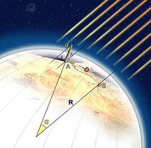- he assumes the simplified (but false) hypothesis that Syene and Alexandria are on the same meridian.