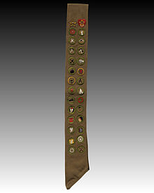 Merit badges exist to encourage Scouts to explore areas that interest them and to teach them valuable skills in Scoutcraft.[4] The award of merit badges sometimes leads to careers and lifelong hobbies.[5] Scouts earn a merit badge by satisfying specified criteria; a Court of Honor is then held to present the badge. Scouts can earn badges at any point in their Scouting career, although this was not always the case — in the 1960s, Scouts first had to earn the rank of First Class before being allowed to work on and earn badges.[6] The higher ranks of Star, Life, and Eagle require merit badges be earned. Certain badges are mandatory to receive these higher ranks. For a few years during the 1980s and 90s, First Aid merit badge was a requirement for the First Class rank.[7] Other mandatory badges include Citizenship in the Community and Environmental Science (see full list). The number of merit badges required for each of these higher ranks has varied historically, as has the ratio of mandatory merit badges and non-mandatory badges for those ranks.[8] Since 2005, Scouts must earn a total of 21 merit badges for the Eagle Scout rank, 13 of which must be from the mandatory list. Once Scouts attain the Eagle rank, they can earn Eagle Palms, a core requirement of which is earning more merit badges.[9]
