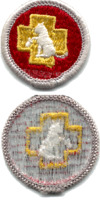 Stitch patterns and thread type such as silk or cotton are not always consistent.[51] There are three known stitching variations among the Type C Personal Health merit badges: "vertical heart", "horizontal heart", and "split heart"; the variation creates the appearance of a split down the middle of the heart. A similar error appears in both Type H and Type J Citizenship in the Nation badges, where colors vary in order from red, white, and blue to blue, white, and red; the reasons for this are unknown. Large and small bell varieties also exist.[54] Most Type C badges come in both cotton and silk thread variations. Emergency Preparedness was made with a red cross from 1972 until 1979, when it was replaced with a green cross in 1980. This change was intentionally made.[55]