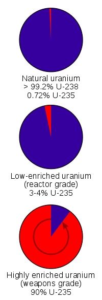 Uranium appears in nature primarily in two isotopes: uranium-238 and uranium-235. When the nucleus of uranium-235 absorbs a neutron, it undergoes nuclear fission, releasing energy and, on average, 2.5 neutrons. Because uranium-235 releases more neutrons than it absorbs, it can support a chain reaction and so is described as fissile. Uranium-238, on the other hand, is not fissile as it does not normally undergo fission when it absorbs a neutron.