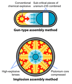 The simplest form of nuclear weapon is a gun-type fission weapon, where a sub-critical mass would be shot at another sub-critical mass. The result would be a super-critical mass and an uncontrolled chain reaction that would create the desired explosion. The weapons envisaged in 1942 were the two gun-type weapons, Little Boy (uranium) and Thin Man (plutonium), and the Fat Man plutonium implosion bomb.