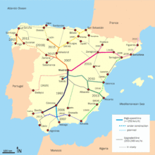 The last steam locomotive was withdrawn in 1975, in 1986 the maximum speed on the railways was raised to 160 km/h, and in 1992 the Madrid Seville high speed line opened,[1] beginning the process of building a nationwide high speed network.