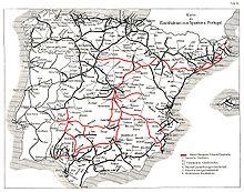 One major misfortune was the decision, taken at an early stage, that Spain's railways should be built to an unusual broad track gauge of 1,672 mm (5 ft 5 13&fras1;16 in), or six Castilian feet). Some believe that the choice of gauge was influenced by Spain's hostility to neighbouring France during the 1850s: it was believed that making the Spanish railway network incompatible with that of France would hinder any French invasion.[3] Other sources state that that decision was taken to allow bigger engines that could have enough power to climb the steep passes in the second most mountainous country in Europe. As a result, Portuguese railways were also built to a broad gauge (roughly the same, 1,664 mm or 5 ft 5 1&fras1;2 in, but rounded to a Portuguese unit). In 1955 Spain and Portugal decided to halve this difference of 8 mm (5&fras1;16 in), and defined their gauge to be 1,668 mm (5 ft 5 21&fras1;32 in), called Iberian gauge.