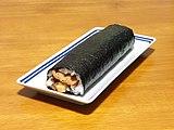 After the invention of the sheet form of nori seaweed around 1750, makizushi or norimaki, rice and various ingredients rolled with nori appeared.[16][17] The term makizushi was first used in a book Ryōri Sankaikyō (料理山海郷, 1749). However this dish is not current day makizushi but seafood rolled with bamboo mat (makisu).[18][19][20] Current day makizushi first appeared in a book Shinsen Kondate buruishū (新撰献立部類集, 1776) which describes makizushi as "Place a sheet of asakusa-nori, pufferfish or paper on the makisu and spread the cooked rice then arrange fishes on it. Roll the makisu tightly from one side ..."[16][18][19][21] In 1778, a food shop guide book Shichijyūgonichi (七十五日, 1778) listed a shop whose famous menu is "norimaki-zushi".[16] A later book Meihan Burui (名飯部類, 1802) describes makizushi as "Spread asakusa-nori on the board, place the sushi rice on it. Ingredients are sea bream, abalone, shiitake, mitsuba and shiso. Roll them firmly...."[17][19][22]