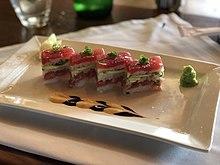 Several years later, a wave of anti-Japanese nativism sentiments and restrictions on Japanese immigration, starting with the Gentlemen's Agreement of 1907, caused a subsequent decline in the acceptance of Japanese cuisine.[27] After the outbreak of World War II, Japanese-American restaurants on the West Coast were generally forced to close and sell off their businesses due to internment orders on their proprietors.[29] One restaurant that reopened after the war to serve sushi was Matsuno Sushi (Matsu-no-sushi) in Little Tokyo, Los Angeles. This restaurant had been in business at least since 1938 or 1939,[30][31] and by 1949, it was back serving sushi (featuring local bluefin tuna[32]) for lunch. But the maki and inari they served was not shaped by hand by trained chefs, but molded in cookie-cutters.[33]