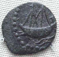 Ancient Indian ship on lead coin of Vasisthiputra Sri Pulamavi, testimony to the naval, seafaring and trading capabilities of the Sātavāhana Empire, during the 1st–2nd century CE.