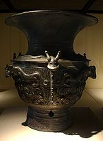 The earliest archaeological evidence of wine fermentation found has been at sites in China (c. 7000 BC),[1][2][3][4][5][21][22] Georgia (c. 6000 BC),[23][24][25][26] Iran (c. 5000 BC),[14][27] Greece (c. 4500 BC), and Sicily (c. 4000 BC).[15] The earliest evidence of steady production of wine has been found in Armenia (c. 4100 BC).[12][13][28][29] The Iranian jars contained a form of retsina, using turpentine pine resin to more effectively seal and preserve the wine and is the earliest firm evidence of wine production to date.[12][13][28][29] Production spread to other sites in Greater Iran and Greek Macedonia by c. 4500 BC. The Greek site is notable for the recovery at the site of the remnants of crushed grapes.[30]