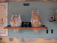 The "Feast of the Wine" (Me-tu-wo Ne-wo) was a festival in Mycenaean Greece celebrating the "Month of the New Wine".[43][44][45] Several ancient sources, such as the Roman Pliny the Elder, describe the ancient Greek method of using partly dehydrated gypsum before fermentation and some type of lime after, in order to reduce the acidity of the wine. The Greek Theophrastus provides the oldest known description of this aspect of Greek winemaking.[46][47]